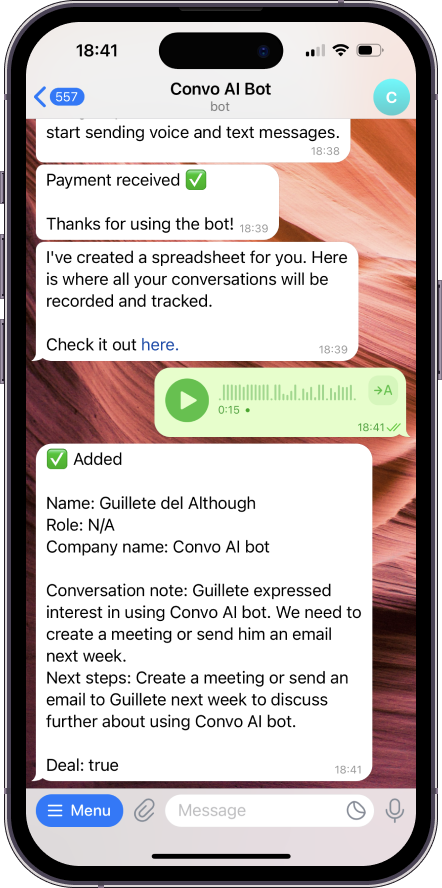 Our AI-driven Telegram bot takes your voice or text messages about sales conversations and smartly logs every detail—from contact names to next steps—directly into a spreadsheet for effortless follow-up and management.